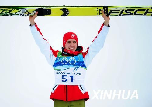 2月13日,瑞士選手西蒙·阿曼慶祝奪冠。當日,在加拿大惠斯勒進行的冬奧會男子跳臺滑雪比賽中,西蒙·阿曼兩跳拿到276.5分,獲得跳臺滑雪標準臺K90男子個人比賽金牌,這也是本屆冬奧會的首枚金牌。