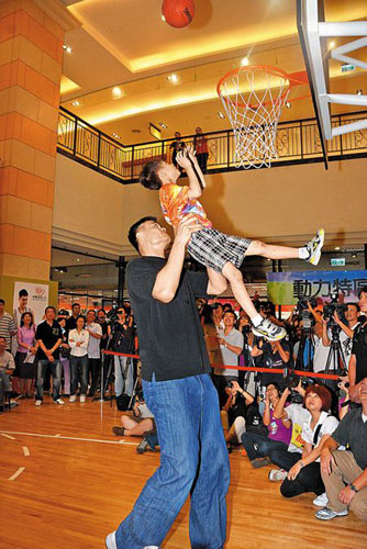 圖為姚明26日晚上到義大世界與小球迷親密接觸,當(dāng)場將小朋友抱起來灌籃。圖片來源:臺灣中國時(shí)報(bào)
