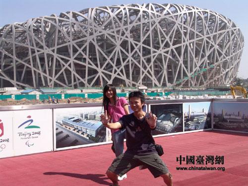 中國臺灣網8月22日北京消息 昨天距2008年北京奧運會開幕還有353天,正在北京參加“兩岸同胞攜手迎奧運”青年交流活動的兩岸青年代表來到北京奧運場館建設工地,參觀了建設中的國家體育場和國家游泳中心,親身感受越來越濃的奧運氣息。
