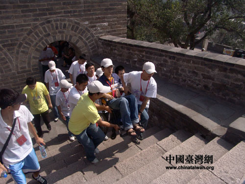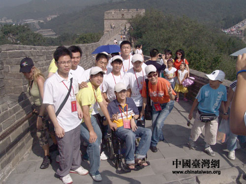 胡翔淳是參加“兩岸同胞攜手迎奧運”青年交流活動中眾多青年代表中最特殊的一個。在日常活動中,胡同學總是坐在輪椅上,但是他并不孤單,因為他的周圍始終有許多關心他幫助他的人們。在這次活動期間,北京體育大學的幾位男生負擔起了照顧他的重任,這也使他們很快成為了朋友。在游覽長城時,遇到陡坡,三四個男生推著輪椅;遇到樓梯,一個男生負責背著他,眾多男生在后面扶著;下長城時,男生們更是一路把他背了下來。