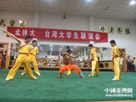 晚上7點鐘,北體大——臺灣大學生聯(lián)誼會正式開始。首先登場的就是千姿百態(tài)、淋漓盡致的北獅表演。獅子們或坐或臥,或飛騰或奔跑,或威猛或溫柔德表演再加上有意思的故事情節(jié)和音樂,引來觀眾的陣陣喝彩;盍疟慕∶啦俦硌菀舱{(diào)動著觀眾們的每一個運動神經(jīng)。值得一提的是,藝術團的同學們還為臺灣同胞準備了舞蹈表演《阿里山的姑娘》,在這些專業(yè)關注眼里,六位阿里山的姑娘表演水平如何呢?一位臺灣女孩豎起大姆指,非常棒!最掉胃口的要算武術表演了,而其中的硬氣功表演更是叫絕,木棒以泰山之勢砸在胳膊上、腿上、后背上全部斷掉,鋼條狠狠的向腦門砸去,脆響過后,斷為兩節(jié)。這樣的真功夫的表演,看的臺灣學子們心驚肉跳目瞪口呆,表演結(jié)束了才回過神來,然后就是齊聲的拍掌,“安可、安可……”整齊的高喊不斷。