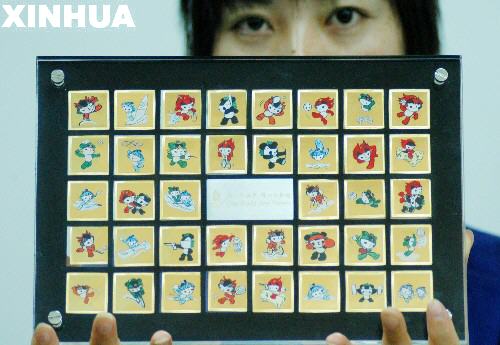 第29屆奧林匹克運動會吉祥物運動造型金銀紀念牌于5月26日在全國發行。金銀牌均有38個吉祥物運動造型。金牌1套38枚,單枚重量10克,發行量3000套;銀牌1套38枚,單枚重量8克,發行量8000套。新華社發(王建中 攝)