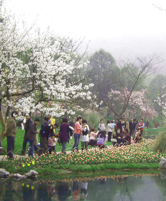 在杭州太子灣公園里,聽著潺潺的溪水聲,游人與郁金香、櫻花甜蜜合影。