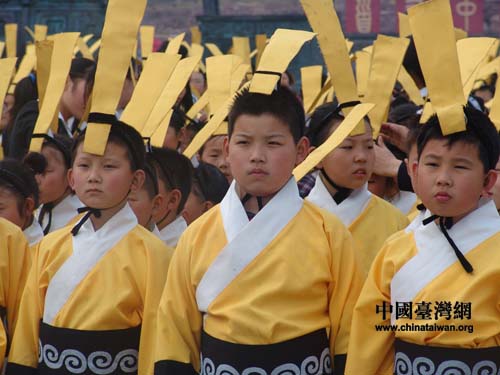 開幕式上身著黃色漢服的小學生(李杰 攝)