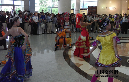 中國臺灣網(wǎng)8月17日南寧消息 “情系八桂——兩岸文化聯(lián)誼行”活動,8月16日上午在南寧市的廣西民族博物館拉開序幕。來自臺灣的101位文化界知名人士,一走進廣西博物館的的大廳,就被一場精彩的唱山歌、繡球傘、獨弦琴構(gòu)成的具有濃郁民族特色的迎賓歌舞所包圍,