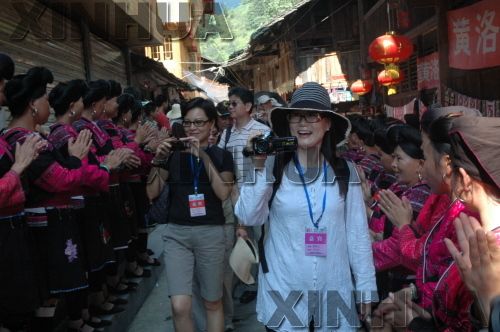 8月21日,在黃洛瑤寨,嘉賓們被紅瑤同胞特殊的歡迎儀式所陶醉。當日,在廣西桂林龍勝各族自治縣黃洛瑤寨,參加“情系八桂—兩岸文化聯誼行”活動的100名臺灣嘉賓和100名大陸嘉賓,和當地的紅瑤同胞進行文化交流、文化參訪和文化聯誼活動,被黃洛瑤寨多姿多彩的民族文化所陶醉。據了解,紅瑤是瑤族的一個支系。黃洛瑤寨是一個紅瑤群眾聚居區,這里的紅瑤文化多姿多彩,今年1-7月已經吸引了7.5萬游客。(周恩平 攝)