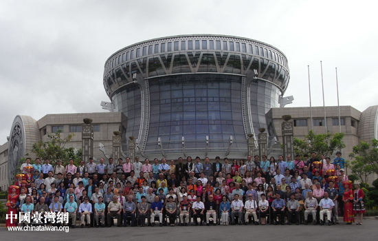 參加“情系八桂——兩岸文化聯誼行”全體嘉賓在廣西民族博物館前合影。廣西民族博物館是一只廣西少數民族的銅鼓造型。(中國臺灣網 蕪同 攝)