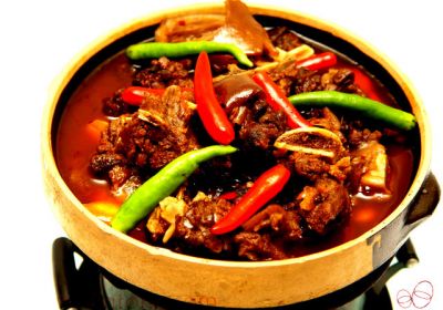 第三說烹煮。狗肉下鍋后不放水,干煮干燜,火候文武要適當,力求熟而不爛,香而不焦,將狗肉煮至“五層樓”(肉塊經煮而爆裂堆砌)便是最佳程度。煮狗肉除用茶油、鹽、醬、醬油外,還配放沙姜、草果、八角、丁香、胡椒、陳皮等十余種香料。香料以紗皮包裹,煮時只取其味而不讓香料散入狗肉之中。狗肉上桌前,再噴些“三花酒”,淋少許桂林腐乳汁。經過如此精心炮制,此時鍋中的狗肉塊塊金黃,奇香四溢,令人垂涎欲滴。