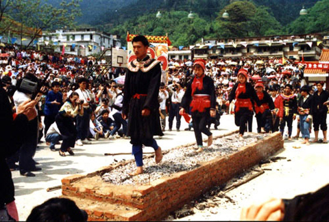 瑤族是民風較為強悍的民族,他們在祭祀、祈福、驅邪的儀式中,往往要進行一系列的絕技神功,以顯示所向無敵的氣概。赤足爬刀梯、過火海就是其中兩項驚險的絕技。 爬刀梯又叫“上刀山”,是在木梯上安裝鋒利的刀子作為梯級,赤足踏在利刃上蹬上蹬下,腳底的肌膚竟絲毫無損。過火海有幾種形式:一是將若干個鐵犁頭燒得通紅,赤足一步一步踏在上面疾行而過;一是走過燃燒木炭的“火!保辉儆芯褪恰白咦銦簟,即用竹筒做成的燈排成行,一步踏一燈地走過,燈火依然熊熊,真是神了!