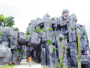 這是和山融為一體的別墅,在外面看是山,里面是廳房。你看,山石上的洞口就是房間的窗口。