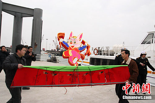 中新網(wǎng)南安2月14日電 (林永傳 郭斌)14日下午,伴隨陣陣的汽笛聲,30盞大型傳統(tǒng)花燈帶著大陸鄉(xiāng)親對(duì)金門(mén)鄉(xiāng)親的祝福,通過(guò)泉金航線啟程前往金門(mén)參加“2011年金門(mén)花燈會(huì)”。