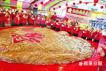 萬斤米糕桃。南投縣松柏嶺受天宮制作重1萬臺斤、號稱全臺最大的元宵超級米糕桃,昨舉行開香揭桃儀式。廟方表示,因玄天上帝腳踩龜、蛇,為了對龜神表示敬意,才將米糕龜改為米糕桃 。來源:臺灣《蘋果日報》 |