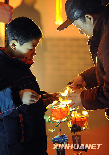 2月7日,在中華門上燈活動(dòng)現(xiàn)場(chǎng),市民給孩子點(diǎn)亮花燈。