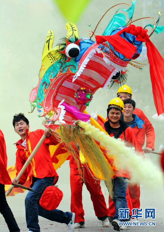 2月16日,德江縣街頭,一支舞龍隊伍在表演。當日,貴州省德江縣的10萬土家族群眾走上街頭舞龍燈、演儺戲、扭秧歌,喜迎元宵節。 新華社記者 劉續 攝