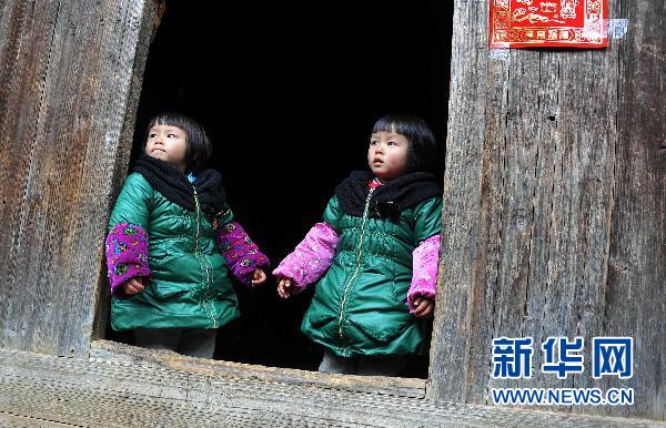 2月17日,曾彭玉和曾彭丹在位于碼市鎮(zhèn)新田埂村江邊的家中。曾彭玉和曾彭丹是一對(duì)3歲大的瑤族雙胞胎小姐妹,元宵節(jié)一早,她們就隨阿爸阿媽來到碼市鎮(zhèn)的鄉(xiāng)場(chǎng)去觀看正在那里舉行的傳統(tǒng)民俗文化展演。今年元宵節(jié),她們將在家鄉(xiāng)與阿爸阿媽一起度過。姐妹倆的父親曾春勝是湖南省永州市江華瑤族自治縣碼市鎮(zhèn)新田埂村的一個(gè)普通農(nóng)民。幾年前,曾春勝從廣東打工回來,在江華縣沱江鎮(zhèn)辦起了一家小型木材店。今年春節(jié),曾春勝和從廣東南海打工回來的妻子彭庚琴,帶著在沱江鎮(zhèn)上幼兒園的兩個(gè)女兒回到了家鄉(xiāng)碼市鎮(zhèn)新田埂村。“瑤山里的春節(jié)是最熱鬧的,雖然在廣東打工的收入不少,但最后我還是選擇回到了家鄉(xiāng),這樣可以照顧到兩個(gè)孩子。” 曾春勝說。 元宵節(jié)這一天,曾彭玉、曾彭丹姐妹倆在位于新田埂村江邊的家中與阿公阿婆、阿爸阿媽一家人團(tuán)聚,慶祝元宵佳節(jié)。晚上,她們還要隨阿爸阿媽再到鎮(zhèn)上去觀看“火燒龍獅”傳統(tǒng)民俗表演。盡管元宵節(jié)過后,阿媽就要回到廣東打工去了,但這個(gè)元宵節(jié)能與家人團(tuán)聚,對(duì)姐妹倆而言依然是十分快樂的。新華社記者 趙眾志 攝 |