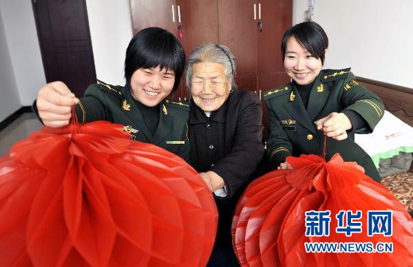 2月15日,唐山市澗河邊防派出所民警帶著燈籠來到敬老院,為王大媽帶來元宵節祝福。元宵節臨近,河北唐山市公安邊防支隊組織所屬基層邊防派出所的民警走轄區登漁船,為孤寡老人送溫暖,向漁民送祝福。   新華社發(盧海鵬攝)