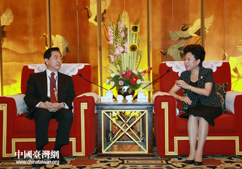11日,“情系巴蜀——兩岸文化聯誼行”活動在成都開幕。圖為四川省副省長黃彥蓉會見前;鶗倍麻L焦仁和。(中國臺灣網 趙輝 攝)