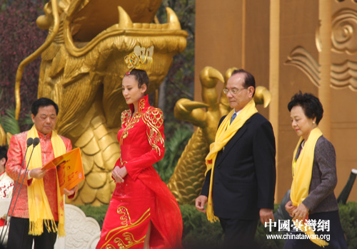 11時,大典進(jìn)入祈福中華環(huán)節(jié)!安菰⑿坌〗忝谩饼埫贰⒅袊皆鹿こ谈笨傇O(shè)計(jì)師龍樂豪、奧運(yùn)冠軍鄧亞萍、中國赴海地維和警察張偉等優(yōu)秀炎黃子孫代表逐一將祈福牌掛上祈福樹,祈福中華盛世。