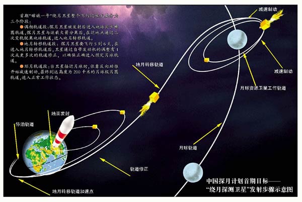 圖表:中國探月計劃首期“繞月探測衛星”發射步驟示意圖