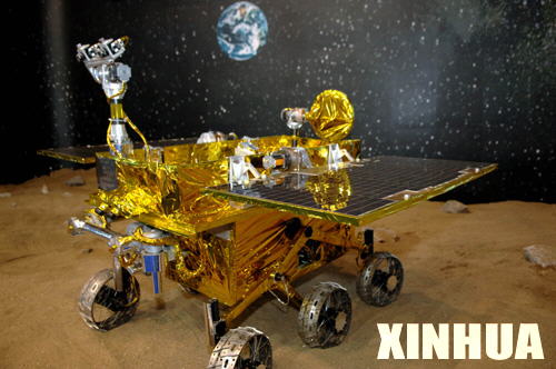 資料圖片:我國自行設(shè)計研發(fā)的月面巡視探測器(簡稱月球車)原理機在第六屆中國(珠海)國際航空航天博覽會上亮相(2006年10月31日攝)。新華社記者周文杰攝