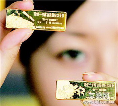 “嫦娥一號”勝利升空,24日下午,限量發行2007套的“嫦娥金條”正式上市。具有唯一限量編號的每套“嫦娥一號”紀念金條含兩根25克AU9999金條。第一根金條精雕象征中華民族的萬里長城、五星紅旗和“嫦娥一號”在太空飛行的姿態;第二根金條雕刻有嫦娥奔月的傳統神話圖案,寓意國人千年的夢想開始變成現實。金條背面雕刻的是“嫦娥一號”在太空的運行圖。中國國家博物館藝術品開發中心監制了這套“嫦娥一號”紀念金條。記者閻彤攝