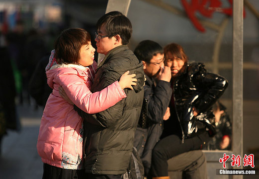 1月31日,兩對情侶在北京西站等候上車。據悉,春運前11天,中國道路客運量達到7.61億人次,同比增長13%。中新社記者 蘇丹 攝