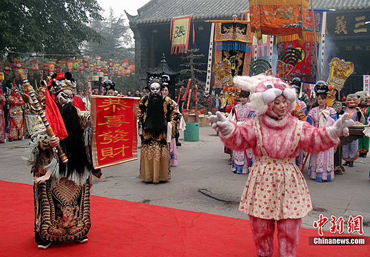 中新網成都2月3日電 (記者 楊杰)兔年正月初一上午10時,“游喜神方”百人仿古祭祀大典在“2011成都大廟會”隆重上演。
