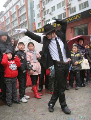 昨日,瀏陽市2011年“玉兔迎春萬象新”元宵節系列活動正式啟動,模仿秀達人胡呈才且歌且舞,將邁克爾·杰克遜模仿得惟妙惟肖。余志雄 攝