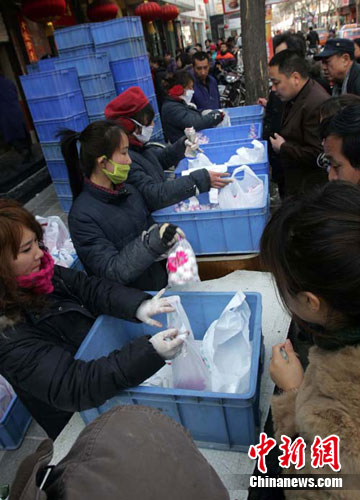 太原街頭17日爆竹聲依稀可聞,鐘樓街上的百年老店“老鼠窟”門前顧客在排隊買元宵成今天此間一道風景。