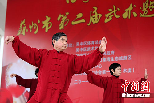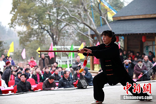 2月17日是兔年元宵佳節,蘇州市第二屆武術邀請賽在木瀆古鎮白象灣景區開賽,14支隊伍的200多名選手現場比試身手,以武會友歡度佳節。中新社發 李克祥 攝