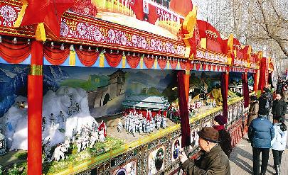 記者看到,超級花燈《東方紅》從市政府廣場一直延續至桃園二巷口,至少數十米長;魹榻M燈,造型類似兒時玩的“拉洋片兒”的放大版,每個“燈箱”有3米多高、4米多長,十幾個這樣的“燈箱”首尾連接到一起,構成了這組氣勢恢宏的組燈。組燈外飾以大紅為主色調,外圍裝飾著紅旗等圖案,花燈中間上部書寫著“東方紅”三個大字。每個“燈箱”講述一個歷史瞬間,如辛亥革命、“五四”運動……在制作上更是煞費苦心,使用了栩栩如生的微縮景觀來還原當時的景象。如講述“五四”運動的“燈箱”,通過水粉畫背景、立體模型和數十厘米高的人偶,再現了學生們激奮游行、火燒趙家樓等一幕幕歷史場景。花燈還配以活動機械和惟妙惟肖的聲、光、電系統,讓觀眾不亞于現場觀看現代版 “木偶劇”。一位中年市民向同伴發出這樣的感嘆:“這組花燈太有創意了。”