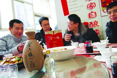 但惟獨,春節喝“福酒”的習慣,依然流傳至今,即便是“禁酒令”出臺,人們寧愿不親自駕車,也難擋春節家人團聚、朋友聚會中飲酒助興的興致。某超市負責煙酒柜的張先生說,“春節,少了酒就沒有氣氛。因此,我們騰開更大的地方來銷售酒類。根據這段時間的情況來看,帶吉利敬酒語的白酒更容易受到消費者的青睞。比如金六福酒有"福運長久,六六大順"的好意頭,所以銷售情況非常好。”