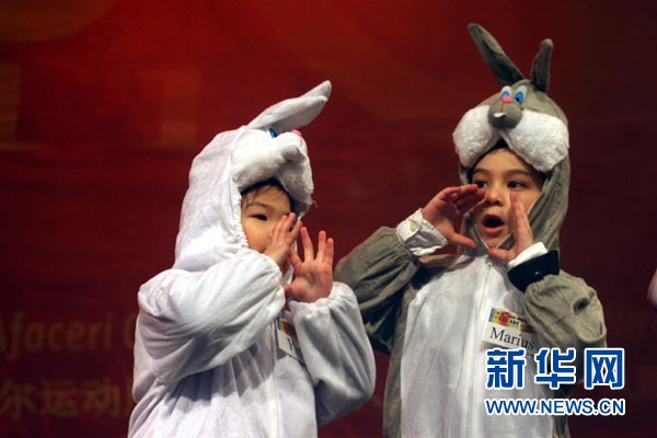 1月29日,在羅馬尼亞首都布加勒斯特,中羅兩國小朋友登臺演出。當天,中國駐羅馬尼亞大使館和布加勒斯特市在北部的“海鷗”公園共同舉辦游園會,迎接中國新春和農歷兔年的到來。 新華社發(佩特雷斯庫攝)