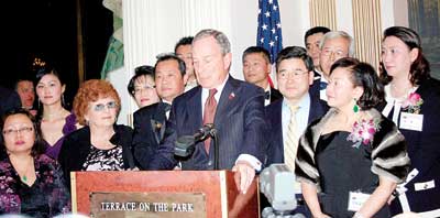 據美國《星島日報》報道,紐約法拉盛華人工商促進會28日晚上舉行第29年度籌款晚會,近千人參加了盛會。紐約市長彭博親自到會上,以華語說“您好”開場,他入鄉隨俗的用粵語說了“恭喜發財”向華人小區拜年,祝賀人人在即將來臨的兔年快樂。