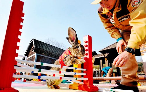 兔年春節(jié)就要到了,可愛的小兔子成了人們的新寵。韓國愛寶樂園不久前特地開辟了“兔子村”,圖為“村”里的兔子正在表演跨欄。
