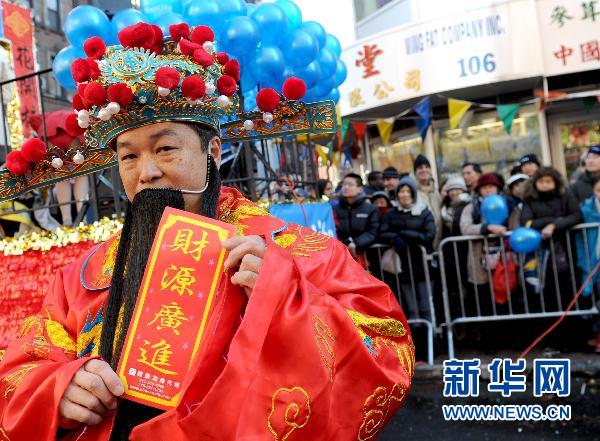 2月6日,在美國紐約唐人街,一位“財神爺”向沿街的觀眾們拜年。當日,美國紐約唐人街舉行新春大游行,慶祝中國兔年春節。 新華社記者申宏攝