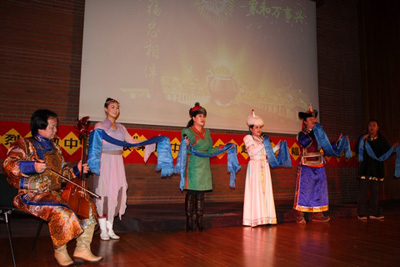 晚會上,以內蒙古民族歌舞劇院為主的藝術家們奉獻了一臺匯集歌舞、器樂的高水準演出,集中展示了蒙古族的草原文化與風情,包括不少國家級非物質文化遺產的獨特風貌。演出在極具蒙古族風情的合唱《成吉思汗》中拉開帷幕,蒙古族長調《贊歌》猶如莽莽草原連綿伸延,絕技“呼麥”恰似滔滔江水奔流翻滾; 激昂奮進的馬頭琴弦奏出了萬馬歡騰的壯觀場面,大家耳熟能詳的經典歌曲《美麗的草原我的家》、《草原之夜》、《敖包相會》和二胡獨奏《賽馬》和《梁祝》、雜技表演《草帽》以及柔美的蒙古族舞蹈《乳香飄》更讓觀眾為優秀的中華文化所折服。整場演出氣氛熱烈,高潮迭起,演員觀眾互動積極,盡顯中華親情。