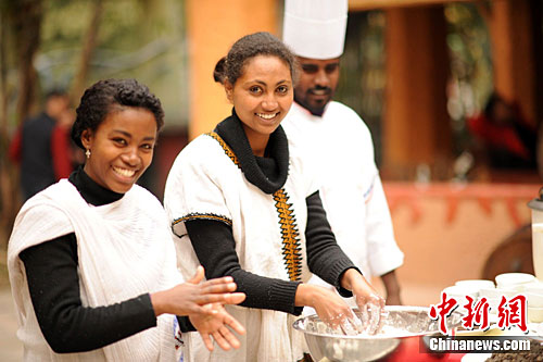 2月17日,農歷兔年正月十五元宵節,重慶10余名外籍人士親自動手包湯圓,歡度中國元宵節。來自埃塞俄比亞的阿白告訴記者,作為非洲老鄉,他們特地在元宵節共聚一堂,借湯圓的美味和吉祥寓意,同享團圓之樂。圖為兩名外國美眉忙著搓湯圓。中新社記者 曹多然 攝
