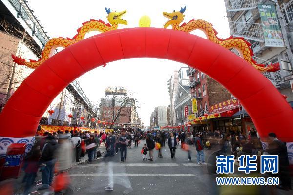 2月17日,人們在美國紐約曼哈頓華埠參加元宵節慶;顒。當天,美國福建公所在紐約曼哈頓華埠舉辦第七屆元宵節活動,讓海外華人在元宵佳節里也能感受到家鄉的溫暖。 新華社記者朱煒攝