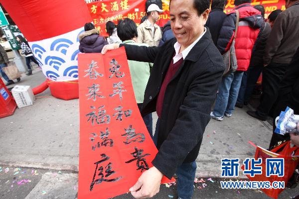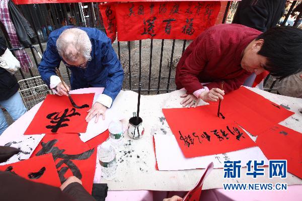 2月17日,在美國紐約曼哈頓華埠的元宵節慶;顒由希绹袊鴷覅f會會員為市民免費書寫春聯。當天,美國福建公所在紐約曼哈頓華埠舉辦第七屆元宵節活動,讓海外華人在元宵佳節里也能感受到家鄉的溫暖。 新華社記者朱煒攝