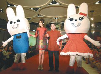 苗栗縣長劉政鴻、名模蔡淑臻昨天與臺灣燈會吉祥物“明明”、“亮亮”走秀,發表臺灣燈會的迎賓服飾。記者宋玟蒨/攝影