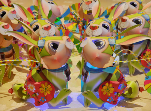 最受歡迎的小提燈“飛天兔寶寶”,造型為一只快樂的兔寶寶戴著護目鏡、穿著繽紛花朵的衣服、乘著五彩降落傘到處去旅行,還有蝴蝶、蜜蜂陪伴一起玩耍。設計人林佳葦說,今年的提把利用紙張交錯切割成降落傘狀,不僅可愛而且具有彈性,可以表現小兔子跳動的躍動感。
