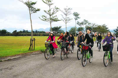 長(zhǎng)發(fā)披肩、皮膚黝黑的導(dǎo)游阿度與我們相識(shí)在腳踏車上,我們跟隨他騎車踏訪臺(tái)東縣鹿野鄉(xiāng)的田園山水。阿度邊騎車邊指著周圍起伏的山巒說(shuō):“右手是中央山脈,翻過(guò)去就是臺(tái)灣海峽,度過(guò)海峽就是中國(guó)大陸。左邊是海岸山脈,越過(guò)去就是浩瀚的太平洋!痹诠镞叄⒍扰d奮地喊道:“這是鳳梨、釋迦、木瓜、枇杷……都是臺(tái)灣最好吃的水果,在這里可以吃到樹(shù)上熟的水果,水多汁甜。”