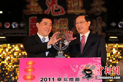 2月17日晚,作為2011臺北燈節特別活動,“關東風情”在雨中閃亮登場。圖為遼寧省長陳政高(右)與臺北市長郝龍斌一起觸摸啟動道具魔球,啟動焰火及兩岸民俗表演。中新社記者 董會峰 攝