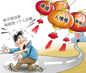 “恐歸”的話端才挑起,就有網友迅速總結了春節不敢回家的“五大怕”:一怕飯局“車輪戰”,太累;二怕春運壓力大,太擠;三怕父母逼婚事,太窘;四怕往來人情債,太煩;五怕節后綜合征,太愁。那么現實的情況是否如此呢?記者隨即做了一個調查,發現以“恐懼”的程度為序,人們“恐歸”的原因如下: