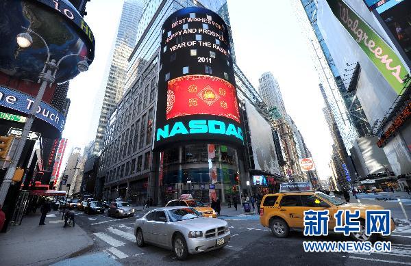 2月3日,在美國紐約,納斯達(dá)克交易所的電子顯示屏上打出“恭賀新春”的字樣。美國紐約納斯達(dá)克交易所當(dāng)天舉行祝賀中國2011年農(nóng)歷新年開市儀式,以這一方式共同慶祝中國的傳統(tǒng)佳節(jié)。新華社記者申宏攝