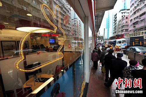 1月24日,香港市民在銀行門前排長隊等候換新鈔。因應市民春節派發利是需求,香港三家發鈔銀行已開始為市民提供換新鈔服務。中新社記者 鄭祚聲 攝