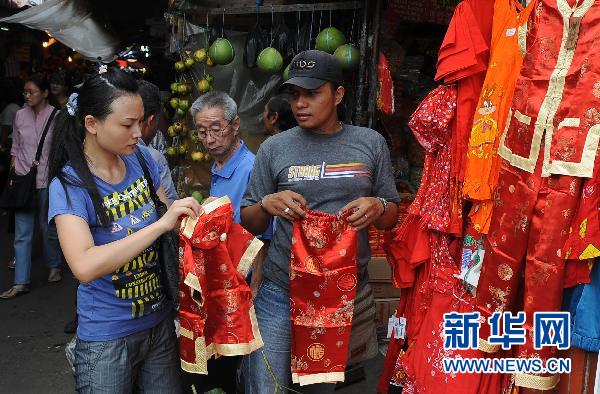 1月26日,在印度尼西亞首都雅加達,一位華人婦女在班芝蘭唐人街上購買喜慶的新年童裝。新華社記者姜帆攝
