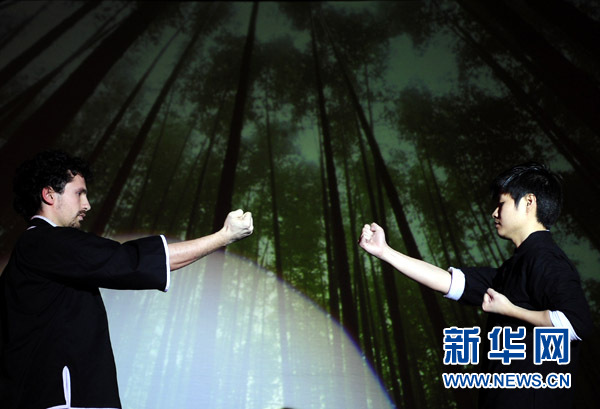 1月28日,在英國牛津市,兩名表演者在全英中國學生學者聯合會主辦的春節晚會上表演中國功夫。當天,全英學聯在牛津市政廳舉行聯歡晚會,慶祝即將到來的中國農歷兔年新年。新華社記者曾毅攝