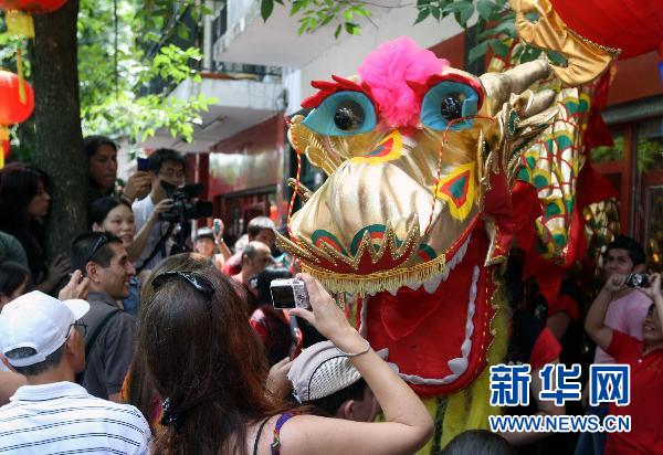 如今,當中國春節來臨,拉美當地居民甚至政府就會帶著激情加入到了拉美華人慶祝春節的隊伍中。我們先看看南美洲規模最大、節目最為豐富的歡慶春節活動之一——由中國駐巴西大使館、駐圣保羅總領事館、圣保羅市政府、巴西華人協會和圣保羅州立大學孔子學院聯合主辦的2010年中國農歷虎年“歡樂春節”活動。活動現場,中國春聯、中國結、20多對大紅燈籠懸掛在廣場兩側挺拔的熱帶棕櫚樹上。人們穿著印有一只只老虎卡通形象和醒目“春”字的大紅T恤,頭頂炎炎烈日,手里還不停揮動著中巴兩國的小國旗。組合音響播放著喜慶的中國民樂,廣場一側則設有多個介紹中國書法、針灸、繪畫、武術等內容的中國文化藝術展亭,夏日正午的廣場上一派節日的歡快喜慶景象。巴西華人協會會長吳耀宙說:“以前過春節,我們也會在室內辦一個聯歡會,但參加的只有華僑華人。由于巴西官方組織協會的參與,今年的春節慶祝活動成為最與眾不同的一次。”